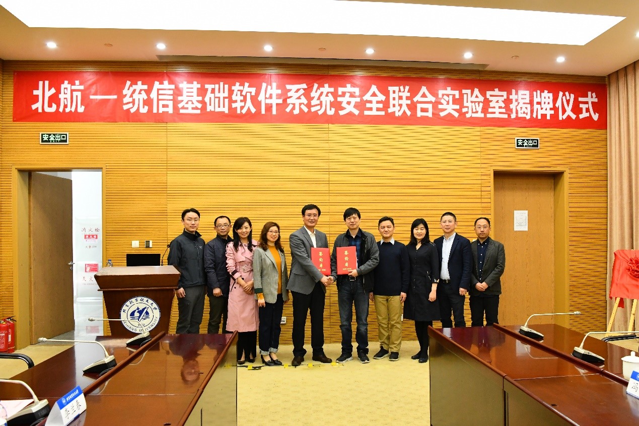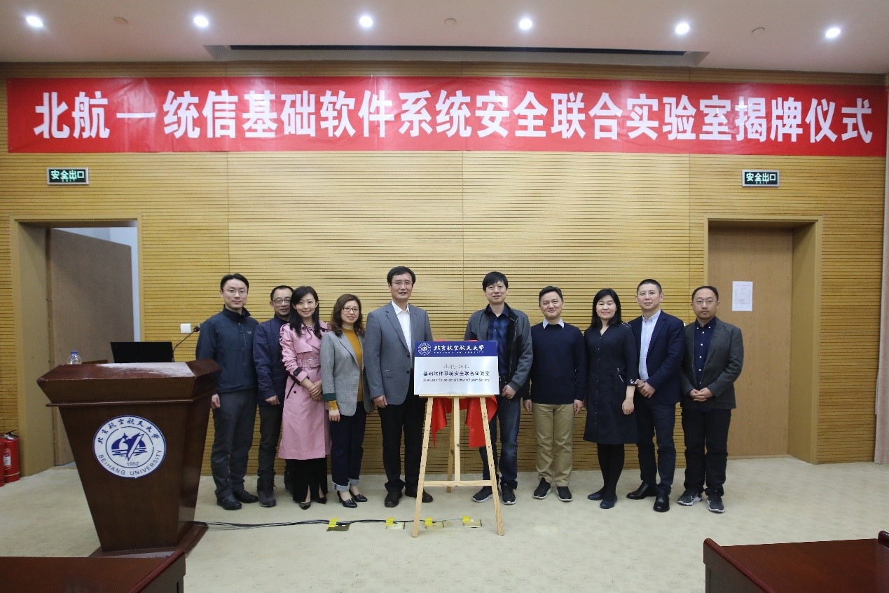 4月12日上午,澳门网投唯一官网(简称:北航澳门网投唯一官网)与统信软件技术有限公司(简称:统信软件)共建“北航—统信基础软件系统安全联合实验室”揭牌仪式在澳门网投唯一官网成功举行。北航澳门网投唯一官网院长刘建伟、党委书记蒋燕玲、副书记祝贺、副院长伍前红、副院长白琳、统信软件总经理刘闻欢、高级副总经理张磊、副总经理许可、副总经理令狐永兴、人力资源总经理武红伟等领导出席并见证本次揭牌仪式。