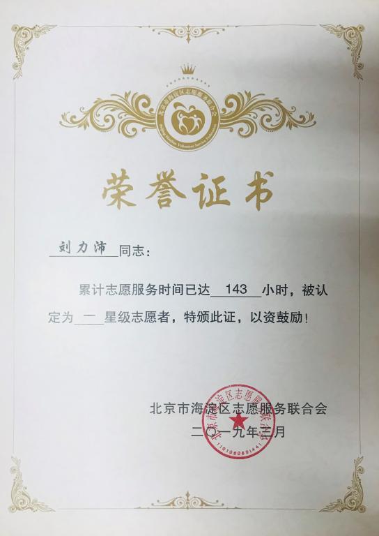 按照 北京市海淀区志愿服务联合会《关于认定星级志愿者以及评选表彰2018年度海淀区明星志愿者、优秀志愿服务团队、优秀志愿服务项目的通知》的相关评比办法,经过单位推荐、材料核实、评委老师评审等程序,我院优秀学生刘力沛获“2018年度海淀区一星级志愿者”荣誉称号,予以表彰。