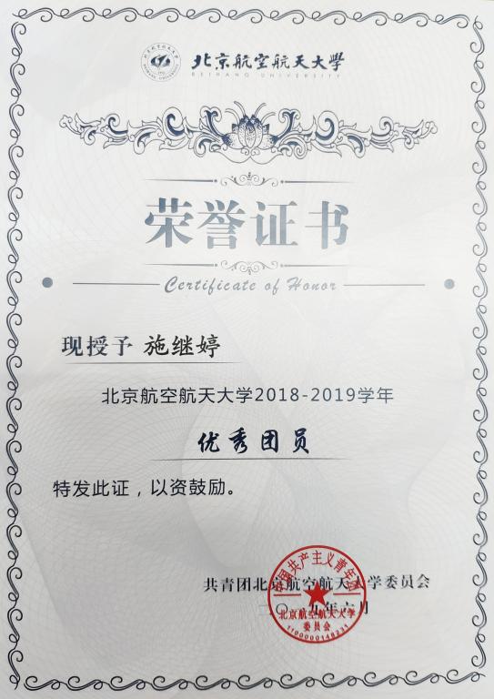 为加强我校共青团的基层组织建设,推动团支部职能化建设,围绕立德树人根本任务,激励基层团支部学习贯彻习近平新时代中国特色社会主义思想,以“四进”为手段,以“四信”为目标,切实学习和践行社会主义核心价值观,弘扬北航“四爱精神”,深入开展“青春心向党·建功新时代”教育实践,创先争优,激励和引导广大团员大力弘扬爱国主义精神,推动各级团组织工作水平的提高。校团委在全校开展2018—2019学年度校 “优秀团员”评选活动,我院优秀学生张英鹏、施继婷获2018—2019学年度校“优秀团员”,予以表彰。