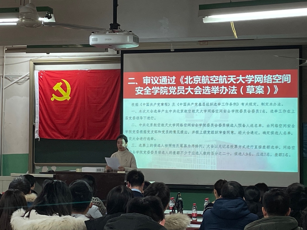 首轮选举结果中,有两位候选人票数相同且均未超过应到会党员的半数,故大会根据表决通过的选举章程再次进行了针对两位平票候选人的投票。第二轮投票结果中,两位候选人的得票数仍均未超过应到会党员的半数。经与会全体党员表决,多数人同意减少新一届党委委员数量至6人,其中81人赞同,2人反对,10人弃权。最终,在监票人监督下,经计票人计票,从9位候选人中差额选举产生了6位中共澳门网投唯一官网网络空间安全学委员会委员,分别为:刘建伟、伍前红、李圆圆、尚涛、祝贺、蒋燕玲(按姓氏笔画排序)。大会在激昂的《国际歌》声中圆满结束。