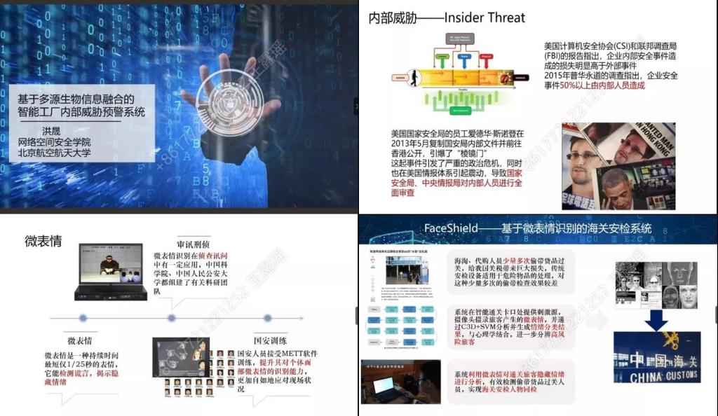 洪晟老师对于何为内部威胁做出解释,并展示了内部安全对于企业的重要性。洪晟老师课题的主要内容是通过摄像头传感器等获取人的微表情、面部颜色、眼动等多元生物信息,利用算法判断内部人员当前状态是否可能产生安全威胁,并向企业发出预警,减少内部威胁。展示了该项目的理论与技术层面的研究过程,以及国内外相关方向学者的研究内容,让同学们受益匪浅。洪晟老师另外还向同学们介绍了由他亲自带队,几位同学完成并获得信息安全作品赛一等奖的课题:FaceShield——基于微表情识别的海关安检系统,并通过一个视频生动的展示了他们研究成果。听完洪老师的精彩讲座,同学们受益匪浅,尤其是对于在网安学院学习的同学们,了解更多网安方向的前沿学术知识对于自己当前的学习与未来的研究都会有很大的帮助。